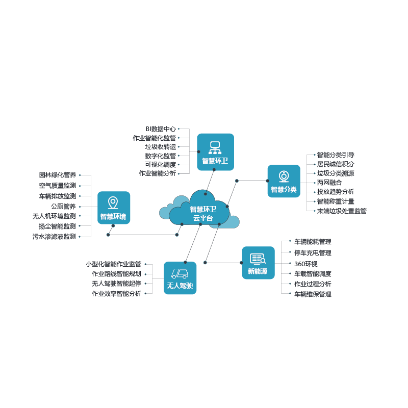基于互联网、物联网、人工智能、大数据、云计算等技术,公司自主开发国内领先的环卫全产业链智慧环卫云平台,该平台拥有58余项智慧环卫相关的软件著作权及专利,汇集全球智慧融合“大云物移智”技术,实时互联城市服务中的人、车、物、事,形成全域服务治理模式,并以“数智化”赋能城市面貌出新出彩。目前平台已在全国254个城市落地环卫数字化运营项目,为全国超10万台产品的客户提供智能服务,为智慧城市建设实现高效的生产空间、宜居的生活空间、和谐的生态空间赋能助力。